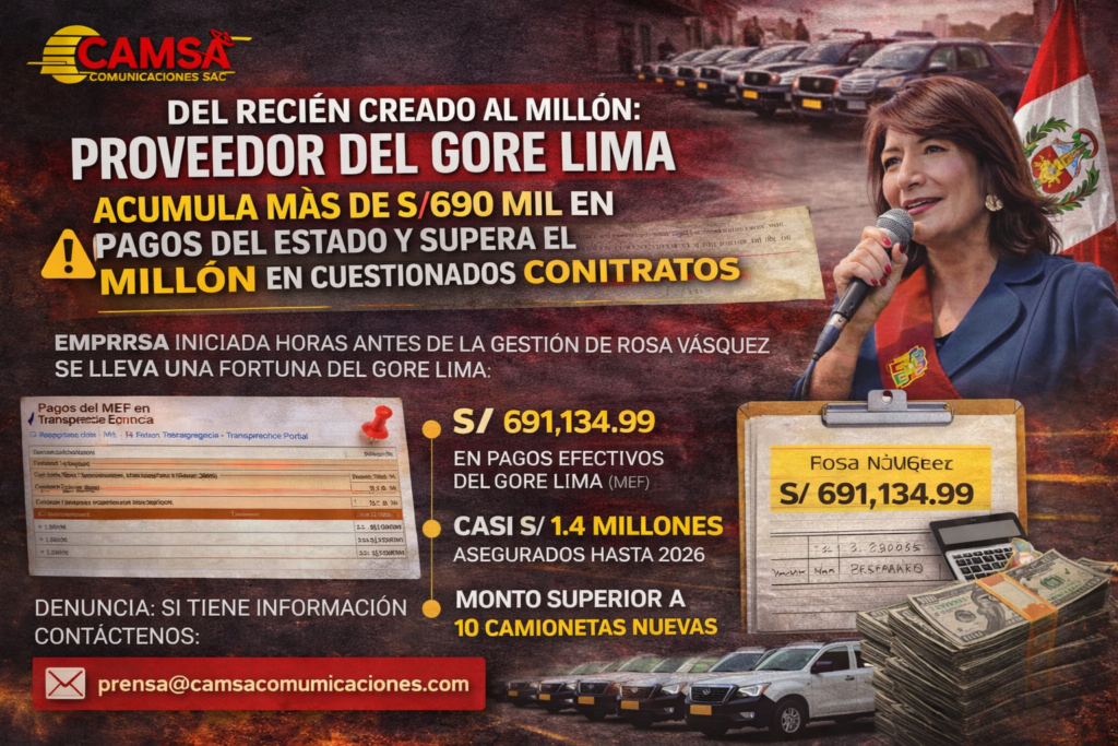 El equipo de investigación de CAMSA COMUNICACIONES revela, con sustento en información oficial del Estado peruano, un patrón de contrataciones que hoy genera serios cuestionamientos sobre el uso de recursos públicos en el Gobierno Regional de Lima (GORE Lima).