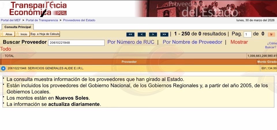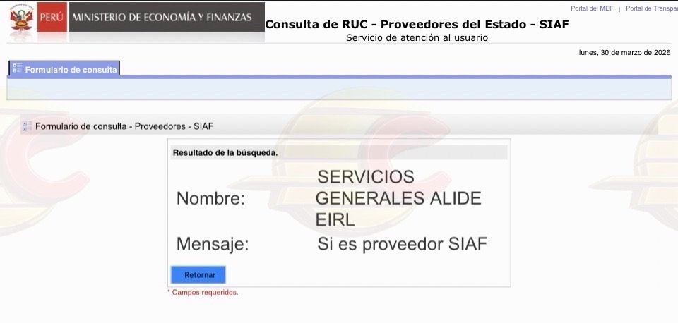 Asimismo, el sistema SIAF (Consulta de RUC – Proveedores del Estado) confirma que Servicios Generales Alide E.I.R.L. figura como proveedor activo del Estado, consolidando su vínculo contractual con entidades públicas.