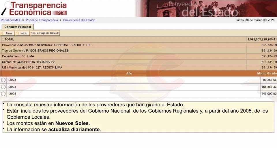 De acuerdo con los registros del portal de Transparencia Económica del Ministerio de Economía y Finanzas (MEF), la empresa Servicios Generales Alide E.I.R.L. registra giros acumulados por S/ 691,134.99 únicamente en su relación con el GORE Lima, dentro del rubro de Gobiernos Regionales.