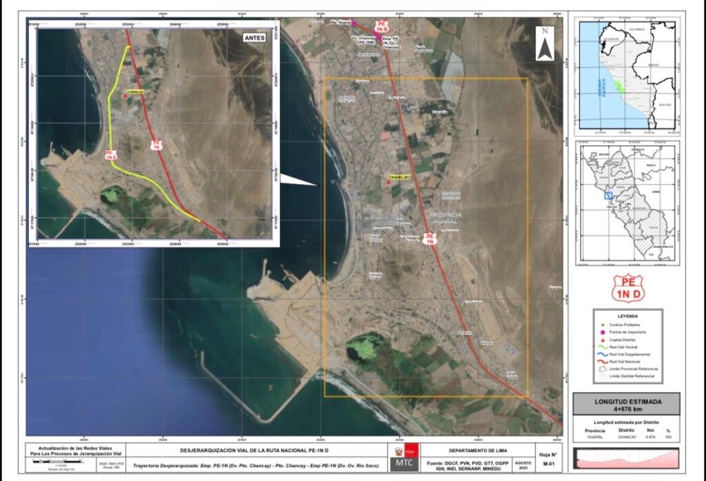 El Ministerio de Transportes y Comunicaciones (MTC) ha declarado PROCEDENTE la desjerarquización vial de la ruta nacional PE-1N D, conocida como la antigua Panamericana Norte, en el tramo que atraviesa el distrito de Chancay.